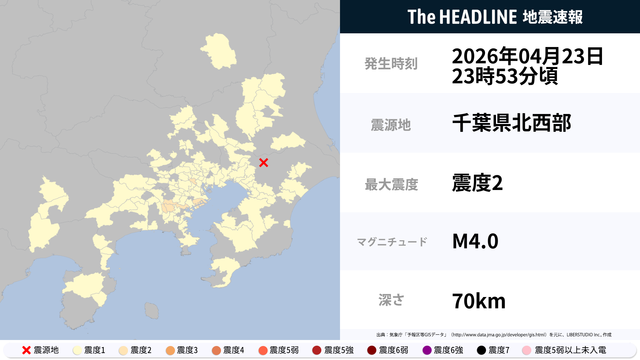 04月23日23時53分頃、千葉県北西部を震源とするマグニチュード4.0の地震が観測された。最大震度2を観測したのは、東京都・神奈川県。