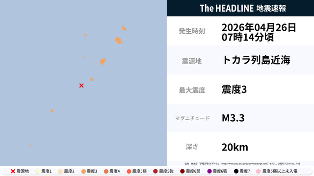 4月26日7時14分頃、トカラ列島近海を震源とするマグニチュード3.3の地震が観測された。最大震度3を観測したのは、鹿児島県。