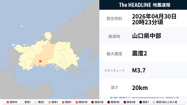 04月30日20時23分頃、山口県中部を震源とするマグニチュード3.7の地震が観測された。最大震度2を観測したのは、山口県。