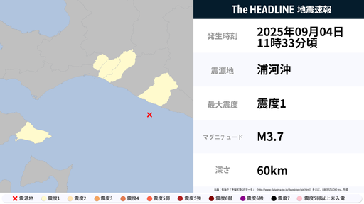9月4日11時34分頃、北海道で最大震度1の地震を観測