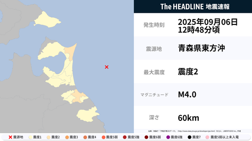 9月6日12時48分頃、青森県で最大震度2の地震を観測