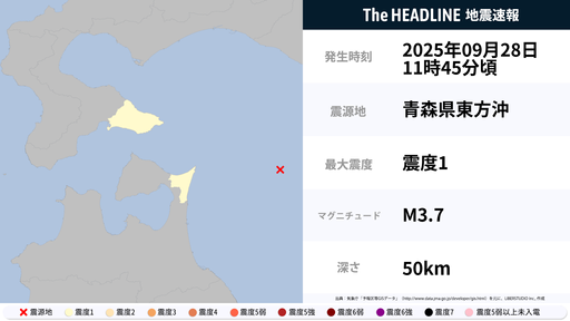 9月28日11時45分頃、北海道・青森県で最大震度1の地震を観測