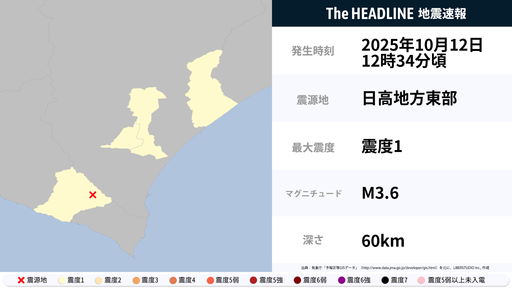 10月12日12時34分頃、北海道で最大震度1の地震を観測