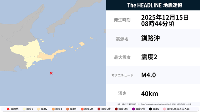 12月15日8時44分頃、釧路沖を震源とするマグニチュード4.0の地震が観測された。最大震度2を観測したのは、北海道。