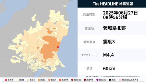 6月27日8時56分頃、福島県・茨城県などで最大震度3の地震を観測