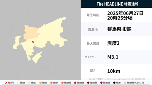 6月27日20時25分頃、群馬県で最大震度2の地震を観測