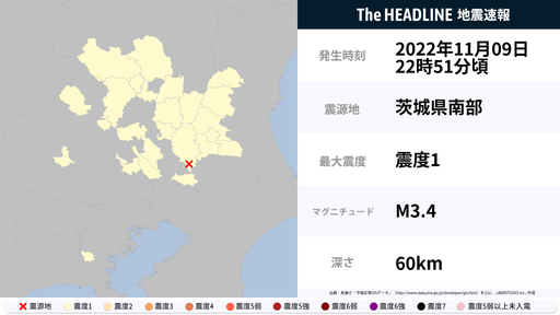 11月9日22時52分頃、茨城県・栃木県などで最大震度1の地震を観測