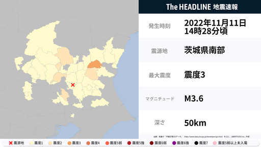 11月11日14時28分頃、茨城県で最大震度3の地震を観測