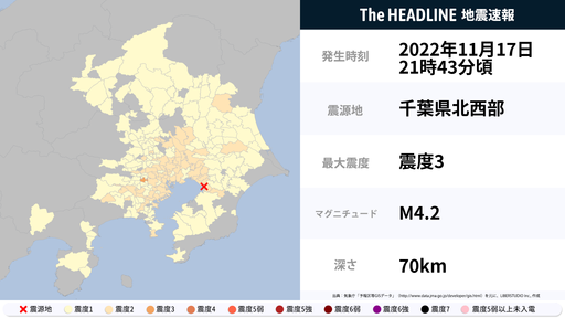 11月17日21時43分頃、東京都で最大震度3の地震を観測