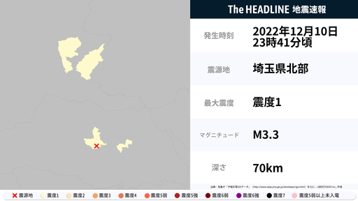 12月10日23時41分頃、群馬県・埼玉県で最大震度1の地震を観測