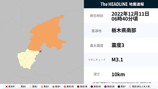 12月11日6時40分頃、栃木県で最大震度3の地震を観測