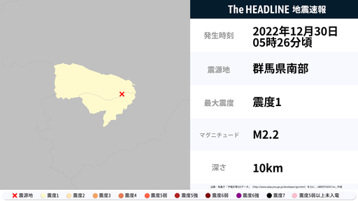 12月30日5時26分頃、群馬県で最大震度1の地震を観測