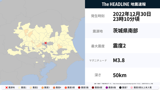 12月30日23時10分頃、茨城県・群馬県などで最大震度2の地震を観測