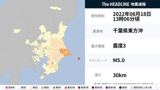 8月18日13時6分頃、茨城県・千葉県で最大震度3の地震を観測