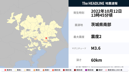 10月12日13時45分頃、茨城県・埼玉県で最大震度2の地震を観測