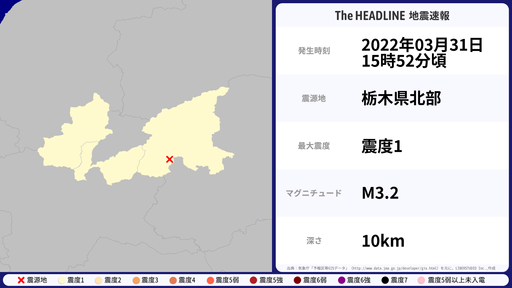 3月31日15時52分頃、栃木県などで最大震度1を観測する地震がありました。