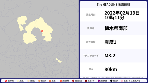 2月19日10時11分頃、栃木県などで最大震度1を観測する地震がありました。