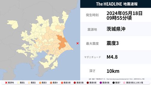 5月18日9時55分頃、茨城県・千葉県で最大震度3の地震を観測
