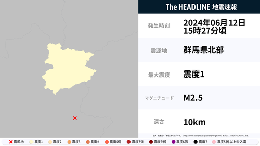 6月12日15時27分頃、群馬県で最大震度1の地震を観測