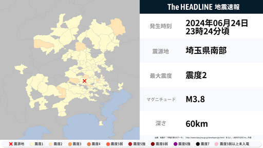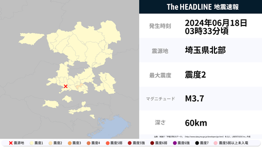 6月18日3時33分頃、埼玉県で最大震度2の地震を観測