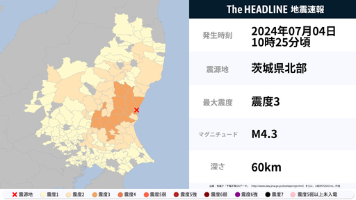 7月4日10時25分頃、福島県・茨城県などで最大震度3の地震を観測