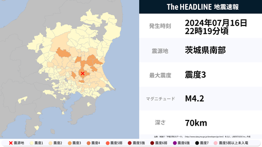 7月16日22時19分頃、茨城県・栃木県で最大震度3の地震を観測