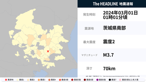 3月1日1時2分頃、茨城県・栃木県で最大震度2の地震を観測