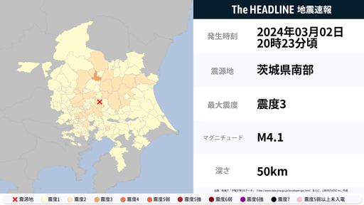 3月2日20時23分頃、栃木県で最大震度3の地震を観測