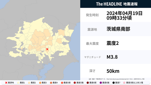 4月19日9時33分頃、茨城県・栃木県などで最大震度2の地震を観測