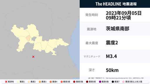 9月5日16時53分頃、茨城県で最大震度2の地震を観測