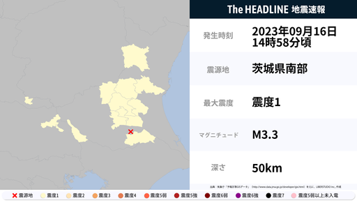 9月16日14時58分頃、茨城県・群馬県などで最大震度1の地震を観測