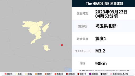 9月23日4時52分頃、群馬県・埼玉県で最大震度1の地震を観測