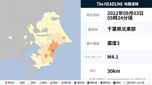 9月3日5時24分頃、千葉県で最大震度3の地震を観測