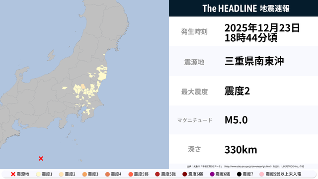 基本情報発生時刻12月23日18時44分震源地三重県南東沖最大震度2マグニチュード5.0深さ330km北緯33.2度 東経137.9度