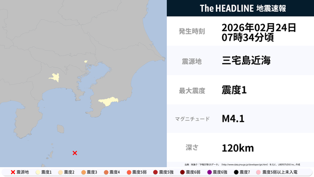 基本情報発生時刻2月24日7時34分震源地三宅島近海最大震度1マグニチュード4.1深さ120km北緯34.4度 東経139.6度