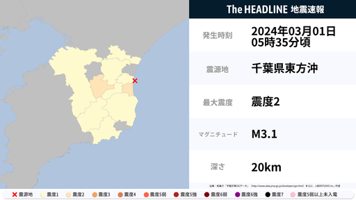 3月1日5時35分頃、千葉県で最大震度2の地震を観測