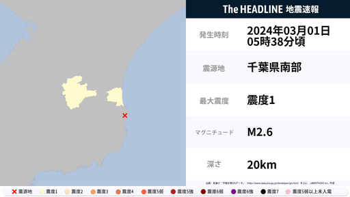 3月1日5時38分頃、千葉県で最大震度1の地震を観測