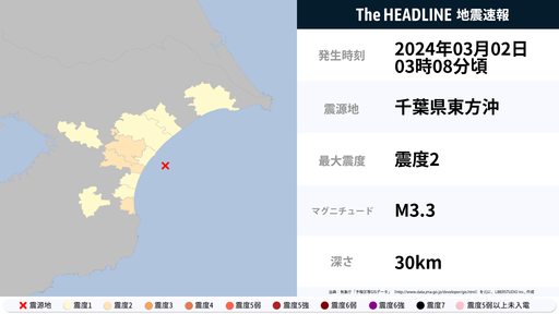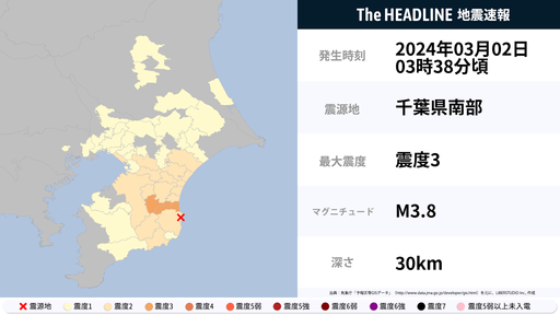 3月2日3時38分頃、千葉県で最大震度3の地震を観測