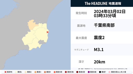 3月2日3時33分頃、千葉県で最大震度2の地震を観測