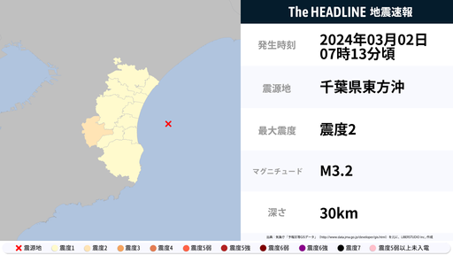 3月2日7時14分頃、千葉県で最大震度2の地震を観測