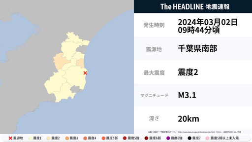 3月2日9時44分頃、千葉県で最大震度2の地震を観測