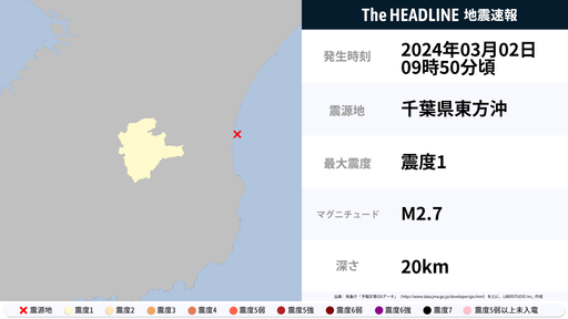 3月2日9時51分頃、千葉県で最大震度1の地震を観測