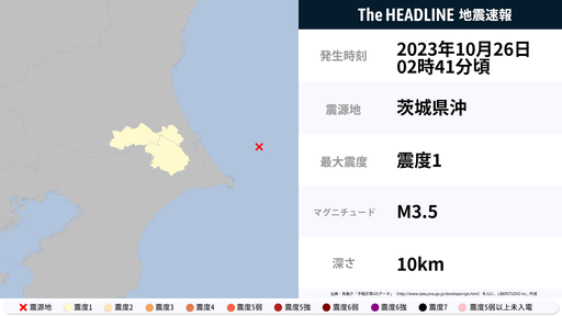 10月26日2時41分頃、茨城県・千葉県で最大震度1の地震を観測