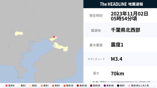 11月2日5時55分頃、千葉県・東京都で最大震度1の地震を観測