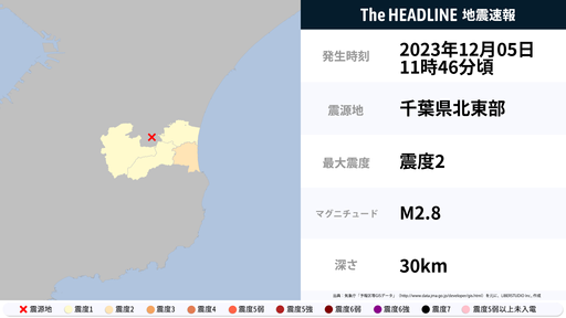 12月5日11時46分頃、千葉県で最大震度2の地震を観測