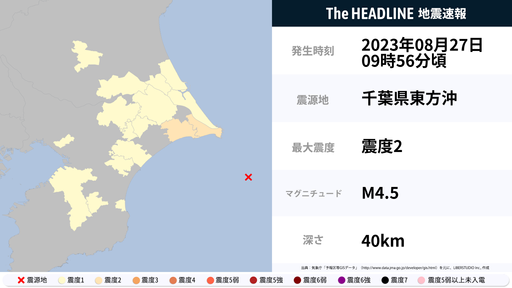 8月27日9時56分頃、千葉県で最大震度2の地震を観測
