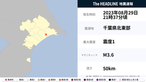 8月29日21時37分頃、千葉県で最大震度1の地震を観測