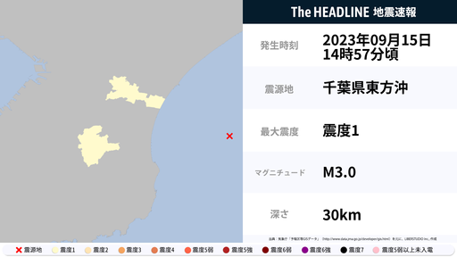 9月15日14時57分頃、千葉県で最大震度1の地震を観測