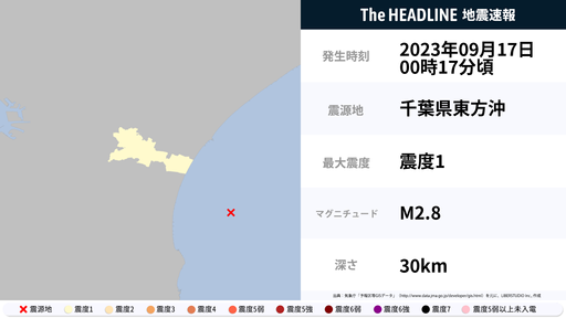 9月17日0時17分頃、千葉県で最大震度1の地震を観測