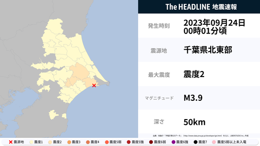 9月24日0時1分頃、千葉県で最大震度2の地震を観測